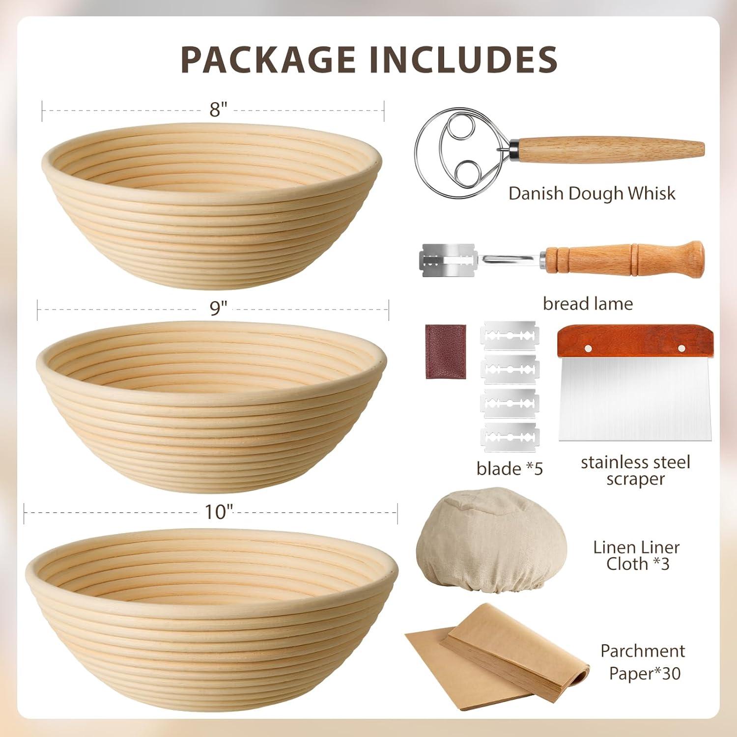 Bread Proofing Basket, Kikcoin Banneton Bread Proofing Basket Set of 2, 9 Inch & 10 Inch Round Sourdough Proofing Basket with Linen Liner, Bread Lame, Dough Whisk(8" Round & 9" Round & 10" Round)