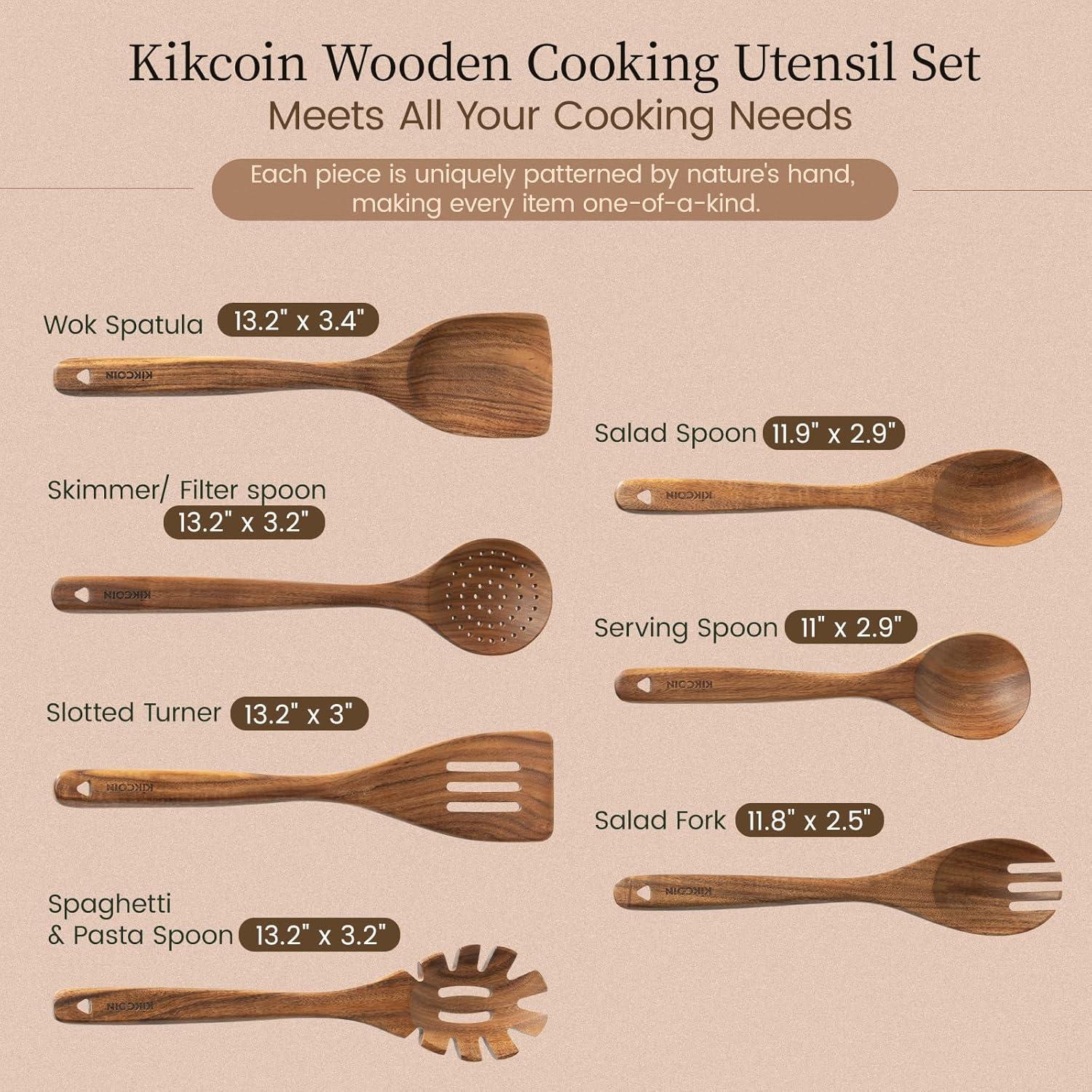 imageKikcoin Wood Kitchen Utensils Set 10 PCS Solid Teak Wooden Spoons for Cooking with Long Handle HeatResistant Wooden Cooking Utensils Set for Nonstick Cookware Including Hanging Hole10 PCS SET
