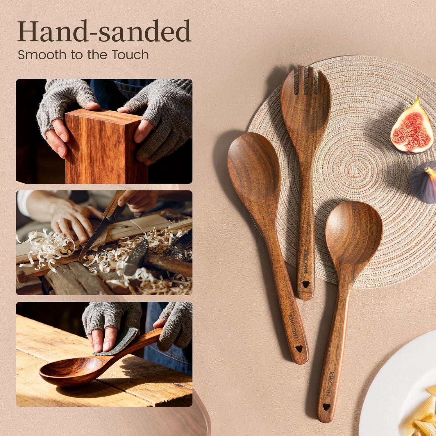 Kikcoin Wood Kitchen Utensils Set, 10 PCS Solid Teak Wooden Spoons for Cooking with Long Handle Heat-Resistant Wooden Cooking Utensils Set for Non-stick Cookware Including Hanging Hole(10 PCS SET)