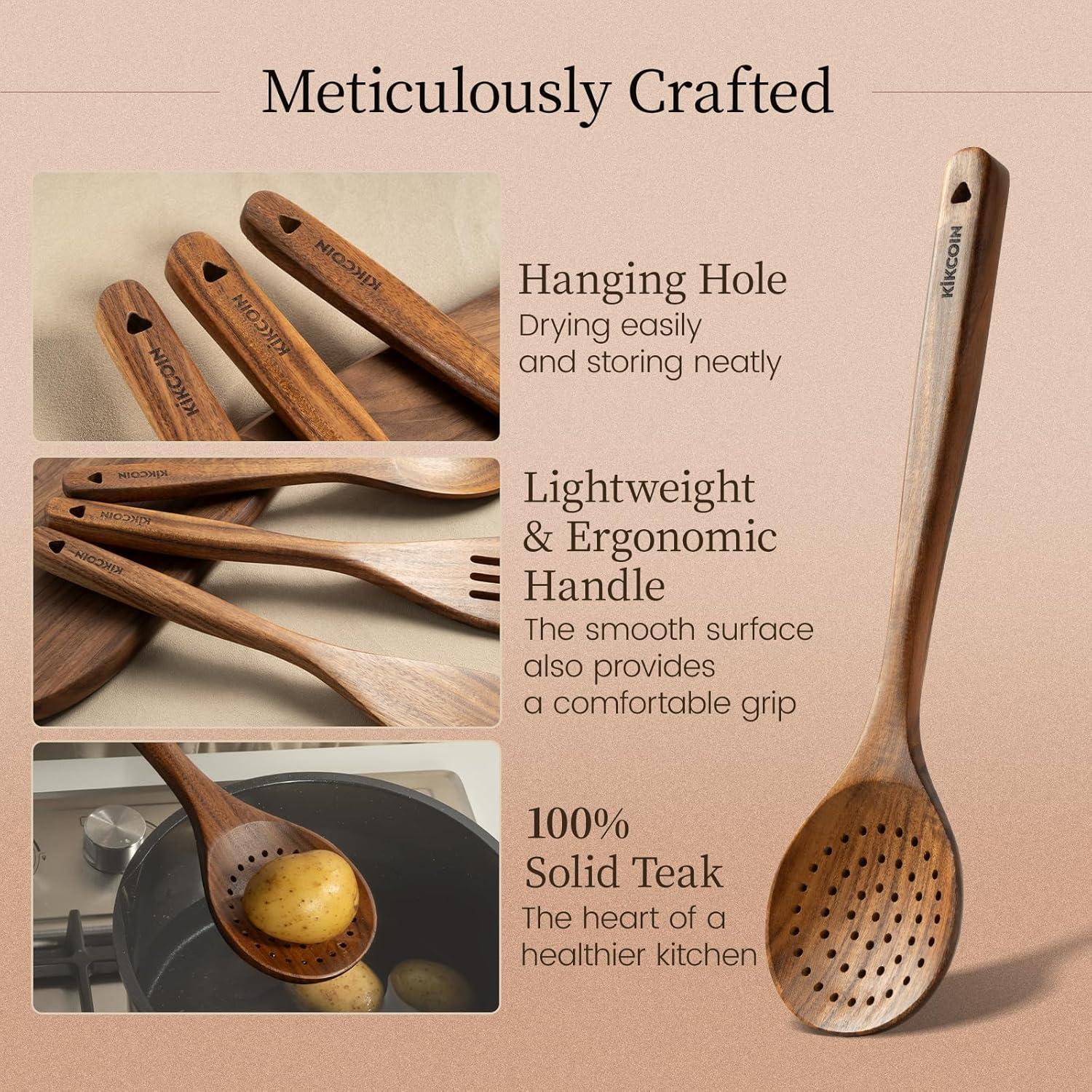 imageKikcoin Wood Kitchen Utensils Set 10 PCS Solid Teak Wooden Spoons for Cooking with Long Handle HeatResistant Wooden Cooking Utensils Set for Nonstick Cookware Including Hanging Hole7 PCS SET
